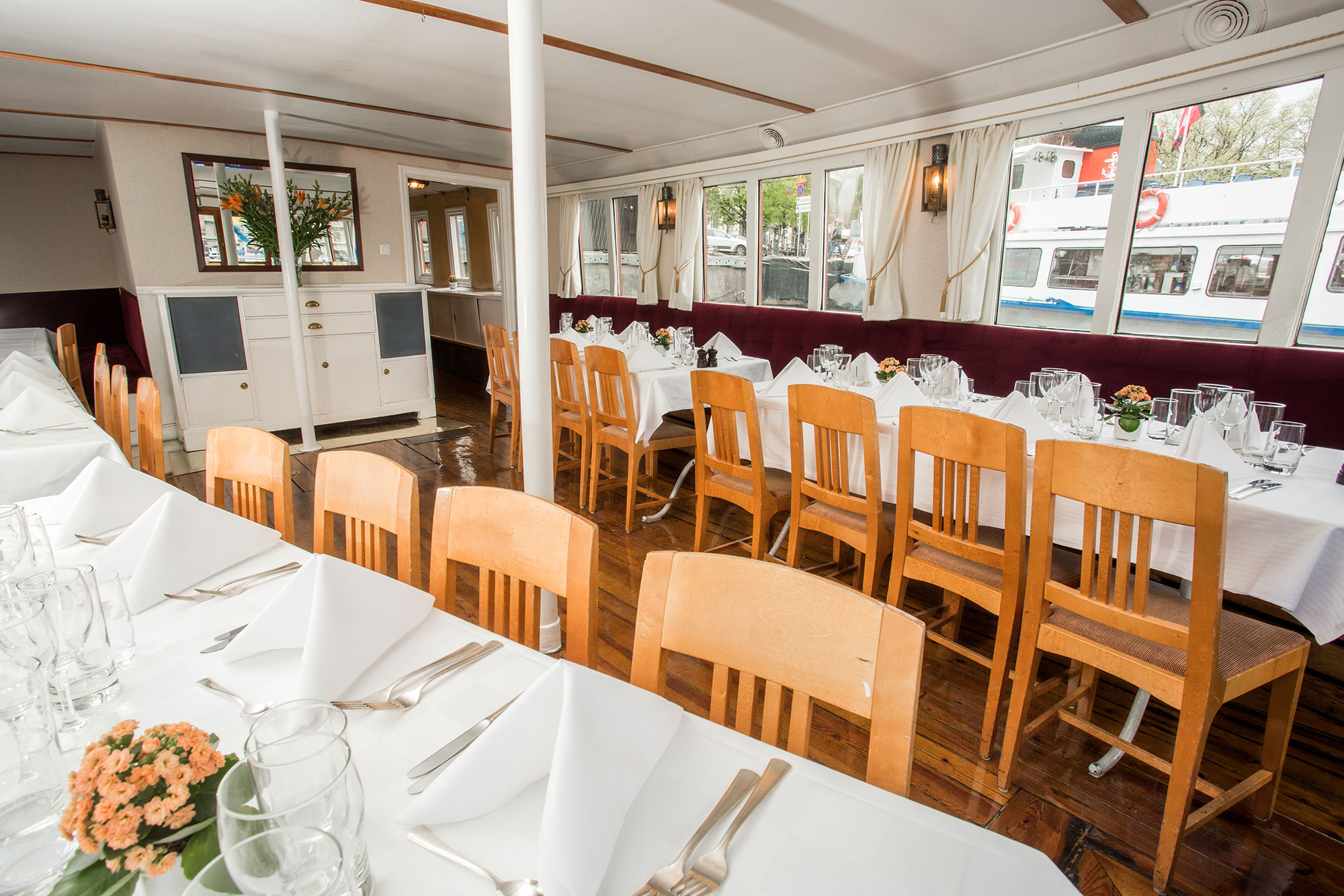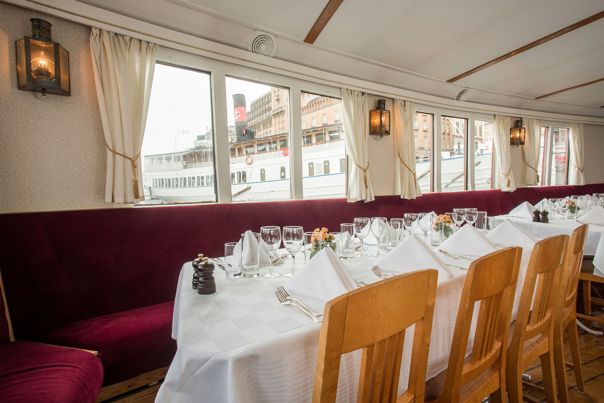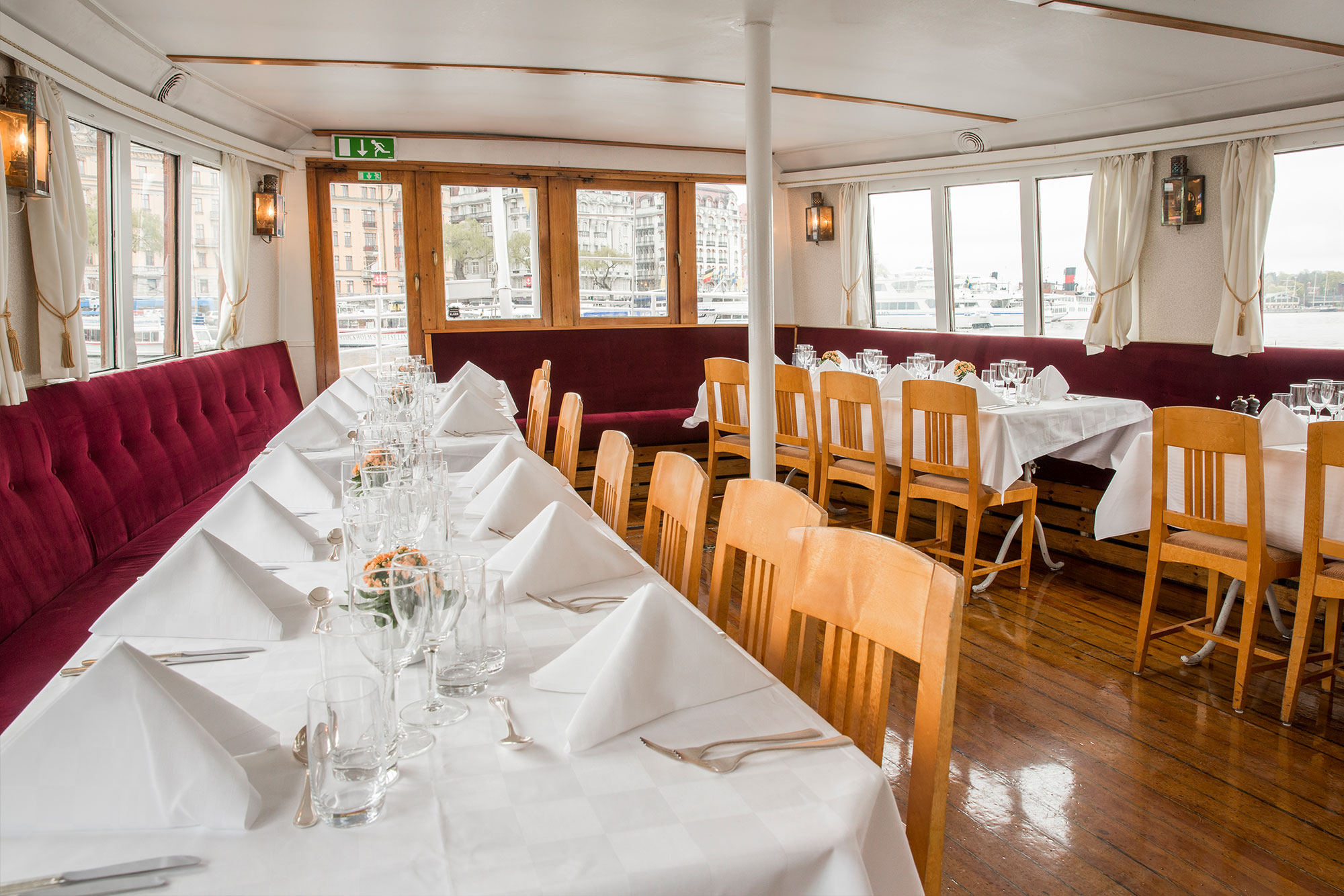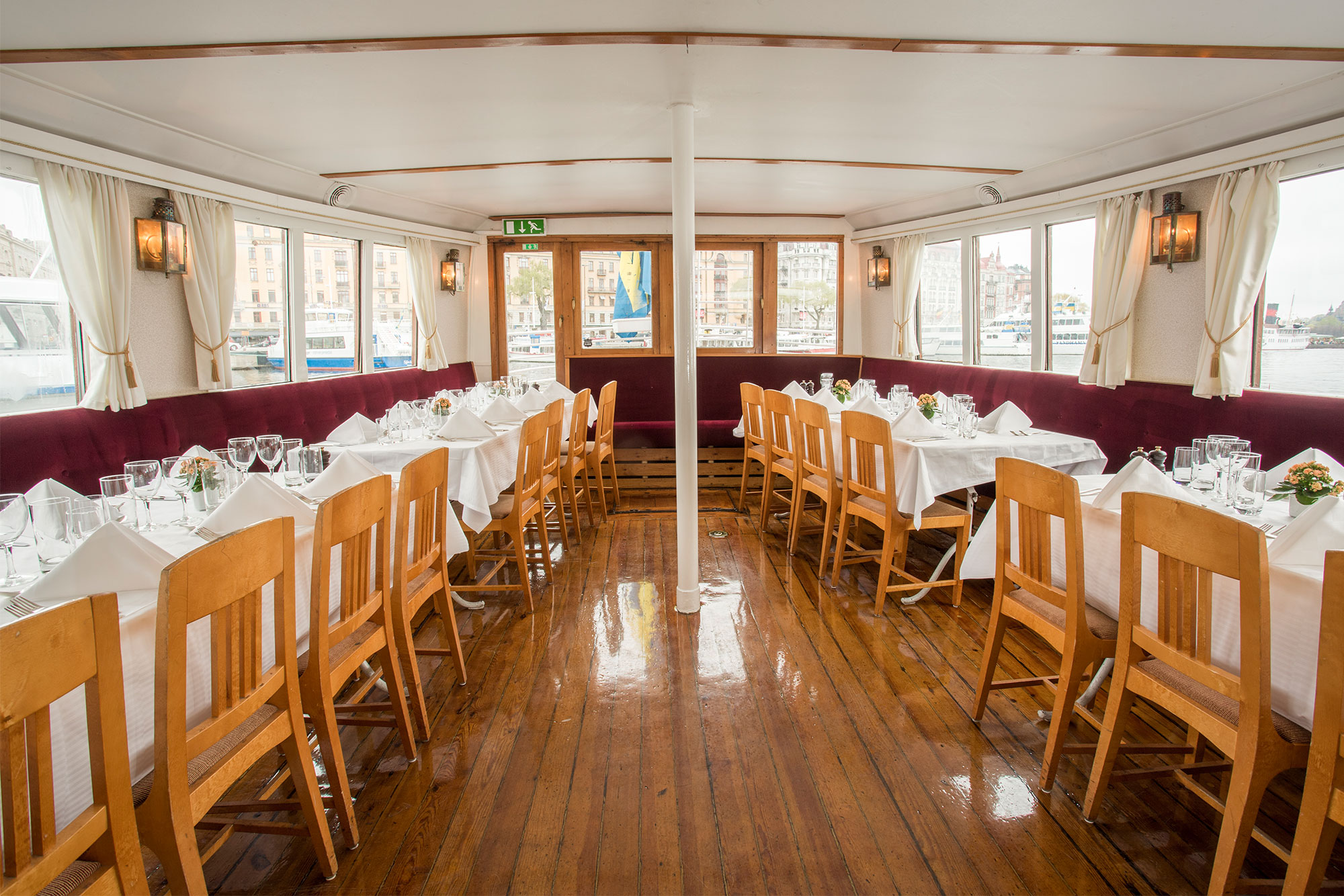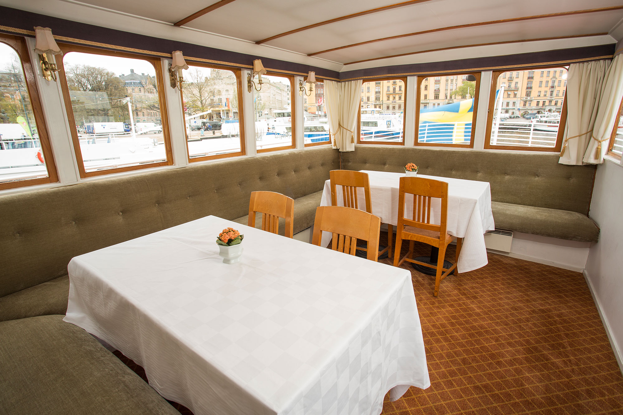 Matsalen ligger på huvuddäck och på övre däck finns en liten salong som är lämplig för kaffet efter maten. Det är ett litet charmigt fartyg som enbart används för festvåningsarrangemang. Välkommen ombord!
